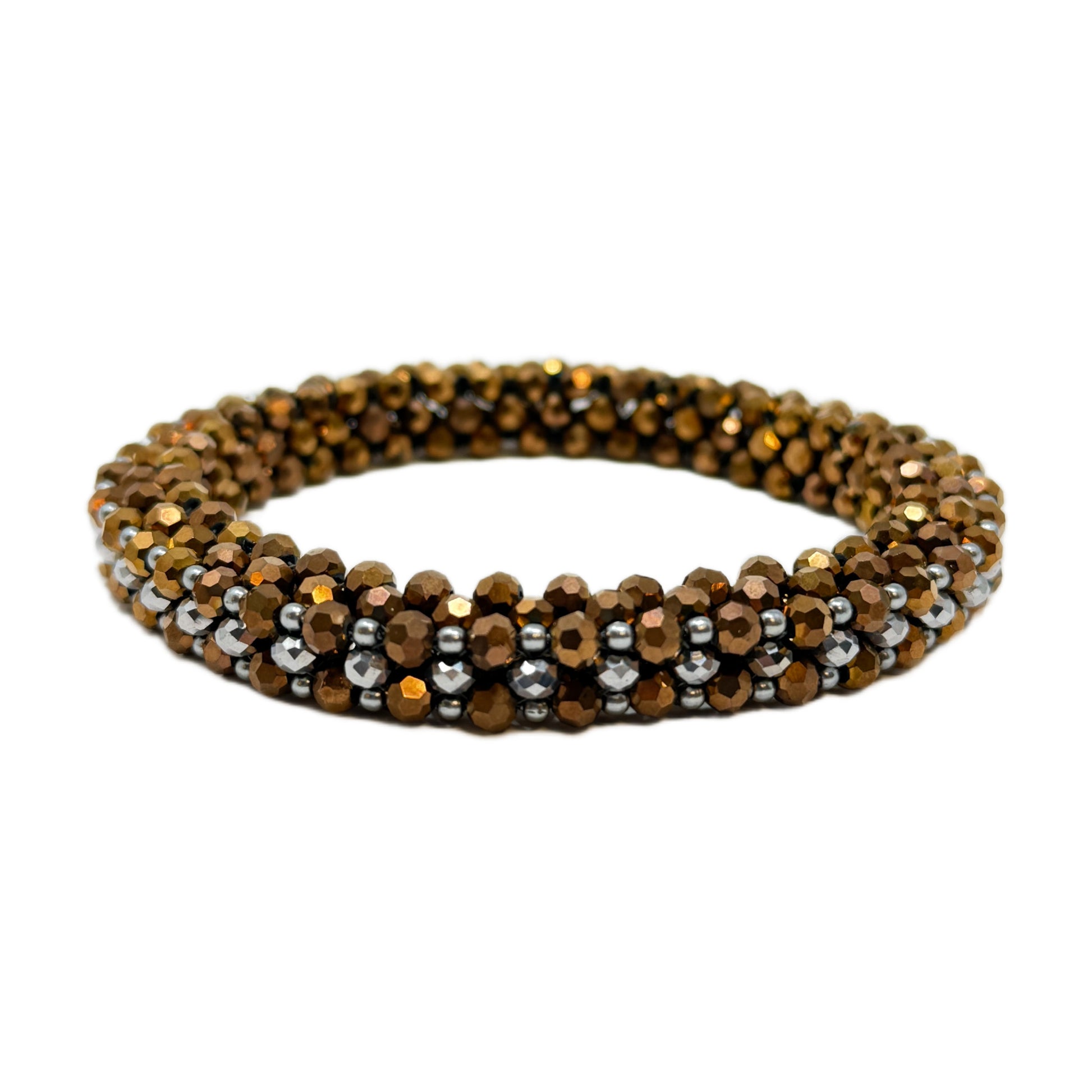 A stunning collection of faceted bronze and round silver beads comprises this woven bangle bracelet. Measures approximately 3.25" in diameter with an opening of about 2.5".