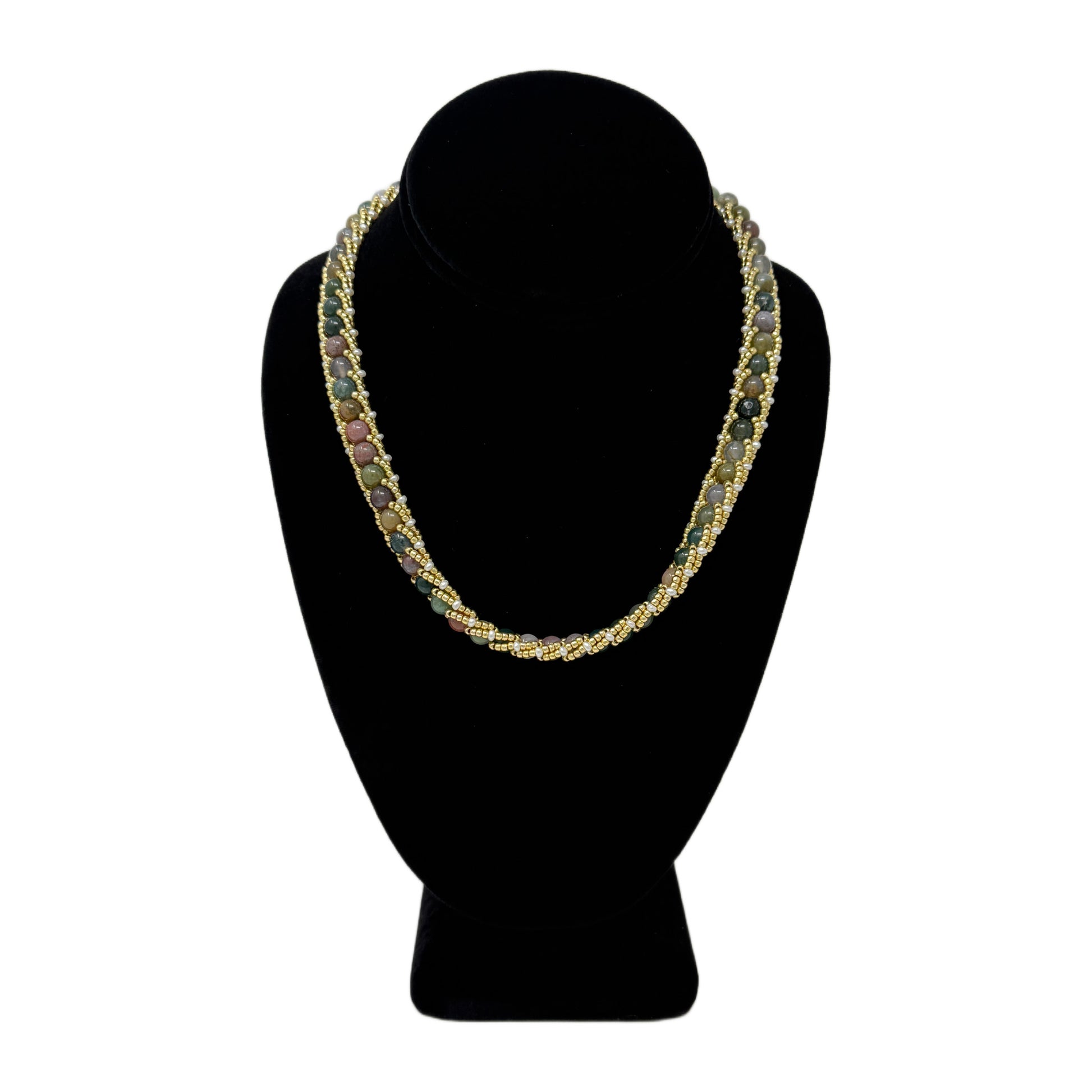 Cool, earth-tone beads in a jasper color wave are surrounded by a brilliantly woven gold spiral in this elegant and one-of-a-kind necklace. Measures approximately 16" long and 0.5" wide.