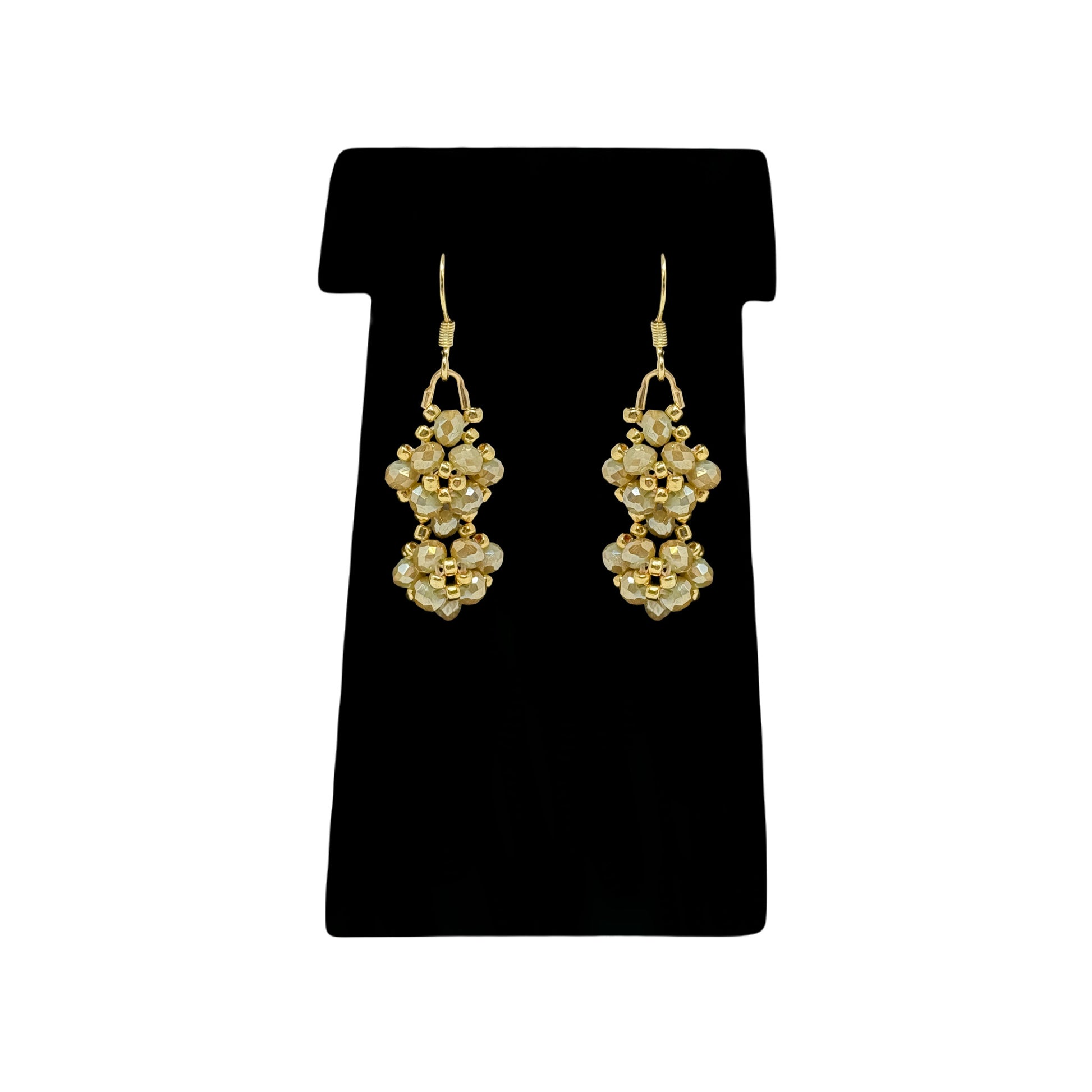 Faceted iridescent beads formed into elegant crests comprise these classic, one-of-a-kind earrings. Measure approximately 0.5" wide and hang approximately 1.5".