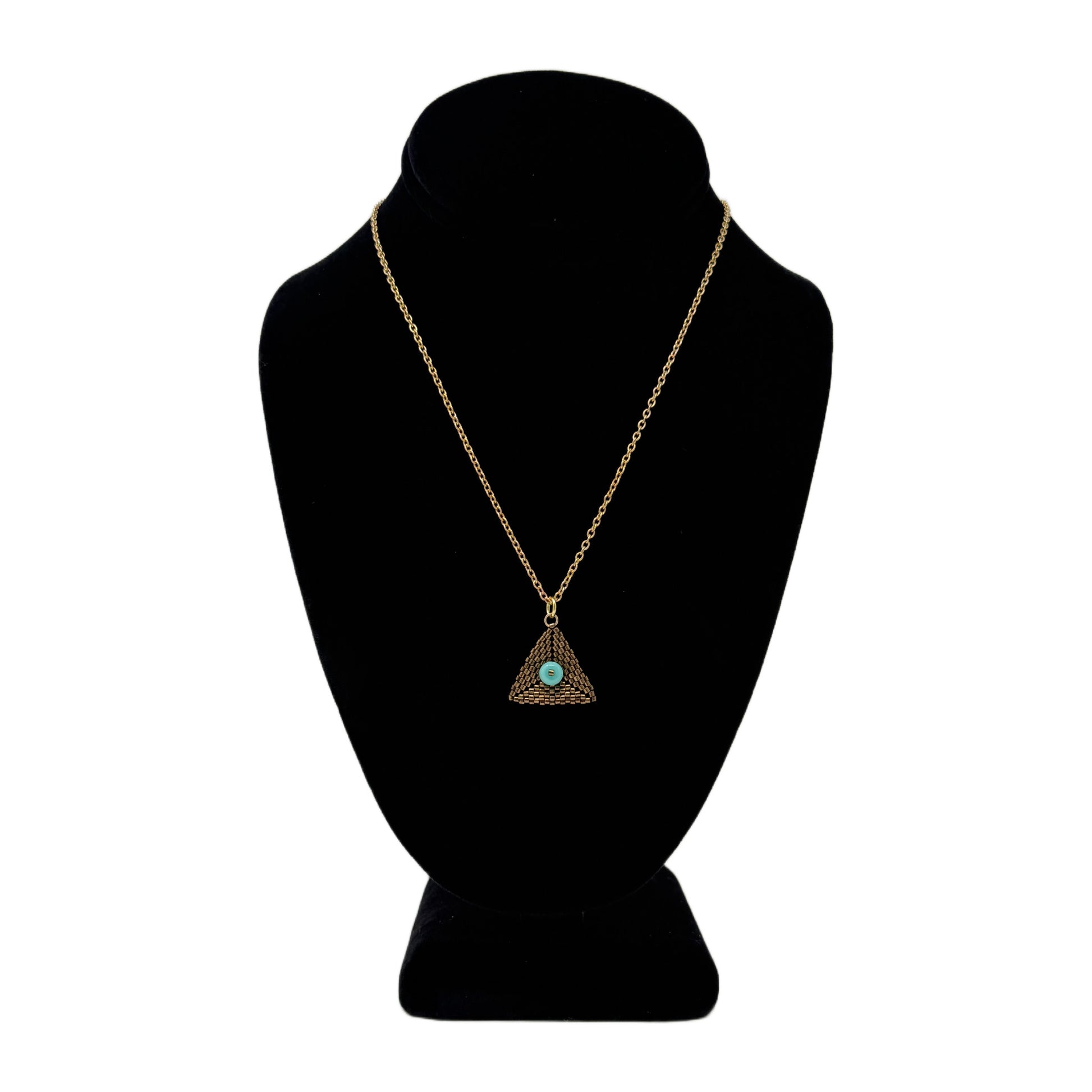 An intricate triangle woven from antiqued gold beads is adorned with a simple aventurine bead in this one-of-a-kind necklace. Pendant measures approximately 1" wide on an 18" chain.
