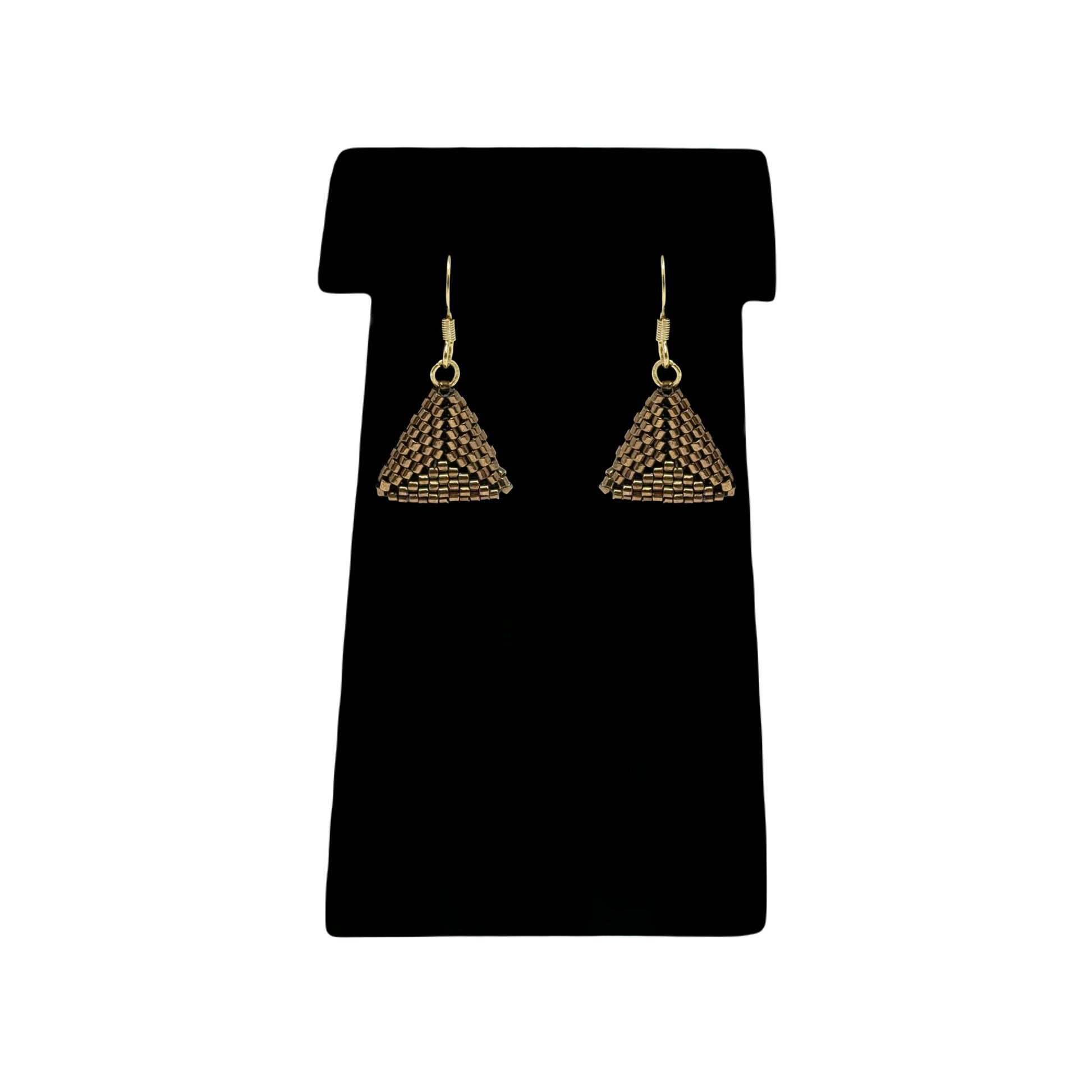 Antiqued gold beads are woven into an intricate triangle in these modern earrings. Measure approximately 0.625" wide and hang approximately 1".