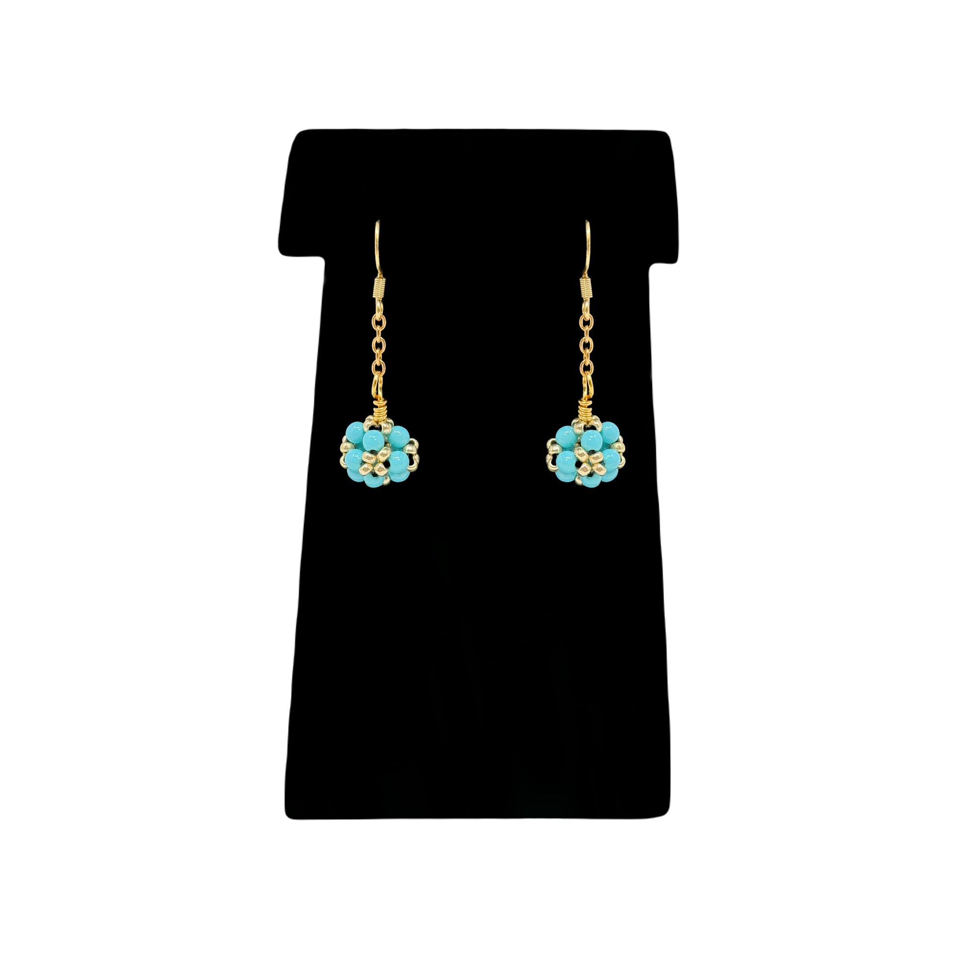 Bright turquoise and shimmering gold beads are woven into a tight ball in these elegant, one-of-a-kind earrings. Measure approximately 0.5" wide and hang approximately 1.25".