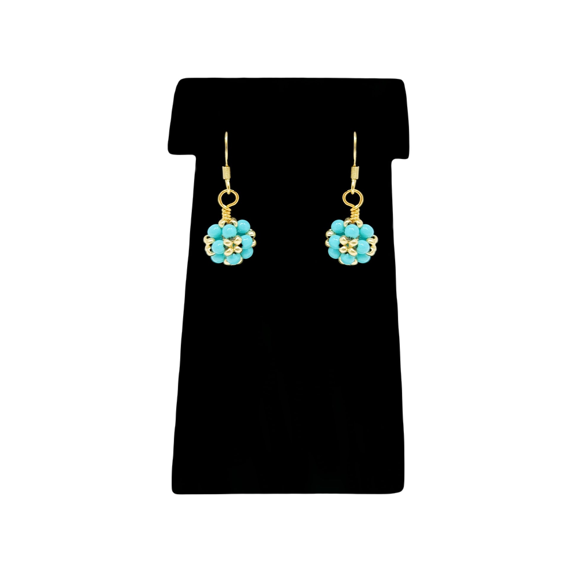 Vibrant turquoise beads and shimmering gold beads are woven into a tight ball in these elegant, one-of-a-kind earrings. Measure approximately 0.5" wide and 1.25" long.
