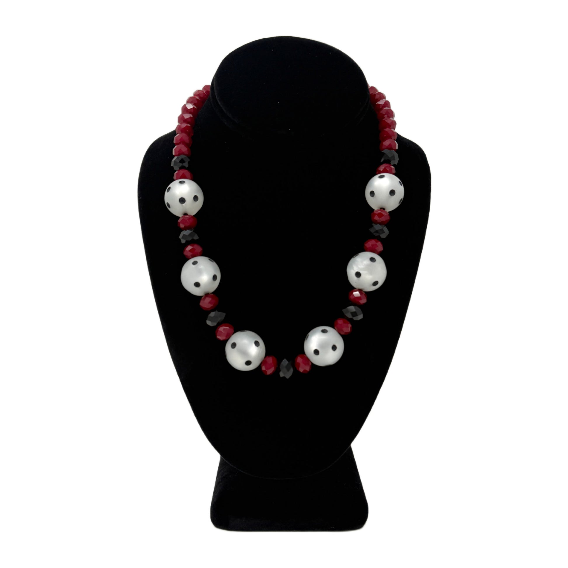 Brilliant red and black beads offset Vintage Italian resin beads with a festive polka-dot design in this one-of-a-kind necklace. Measures approximately 18" long with the largest beads measuring roughly 0.625" in diameter.