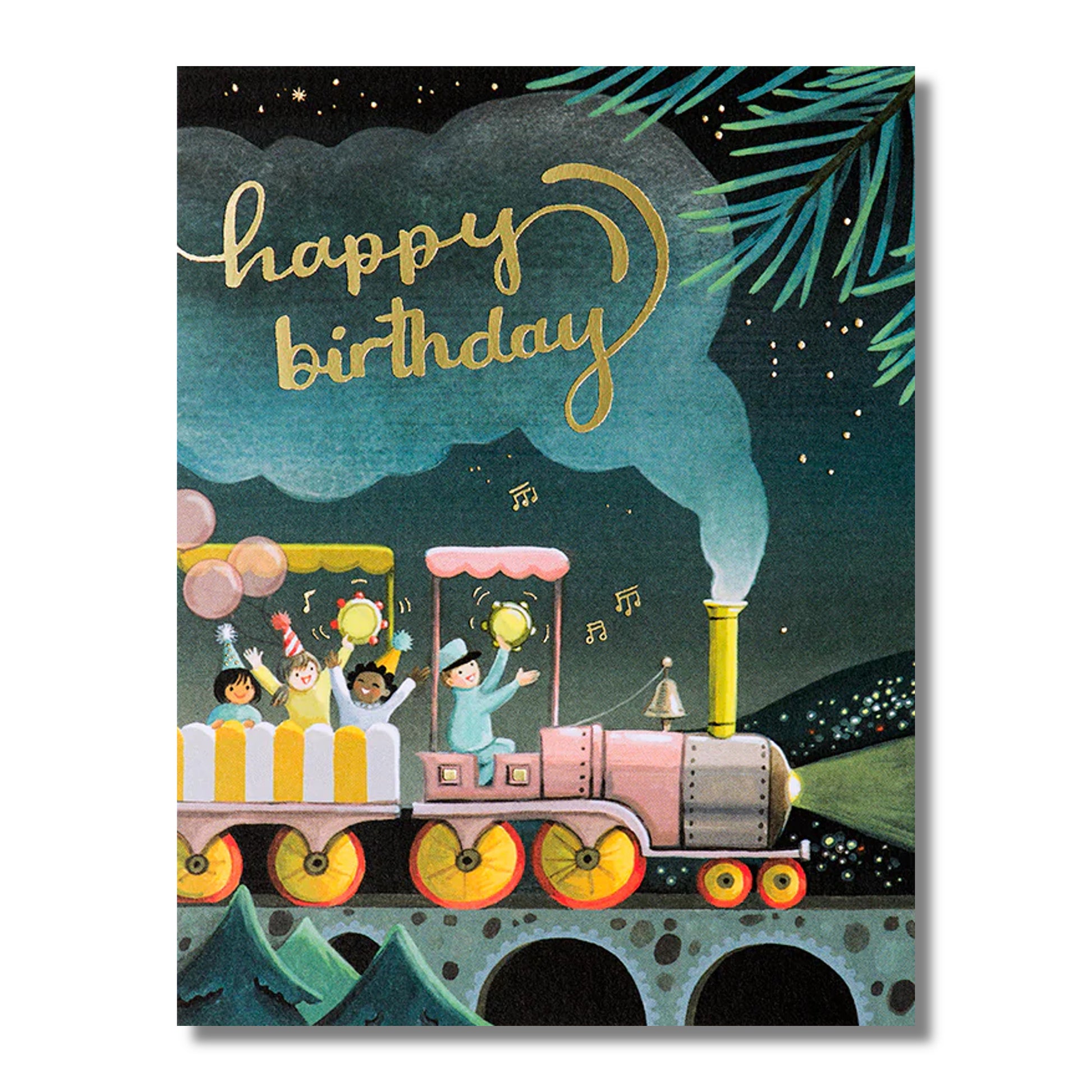 All aboard the birthday train! With shimmering gold-foil details and rich colors, this greeting card by Joo Joo Paper is certain to delight its recipient. Measures approximately 4.25" x 5.5".