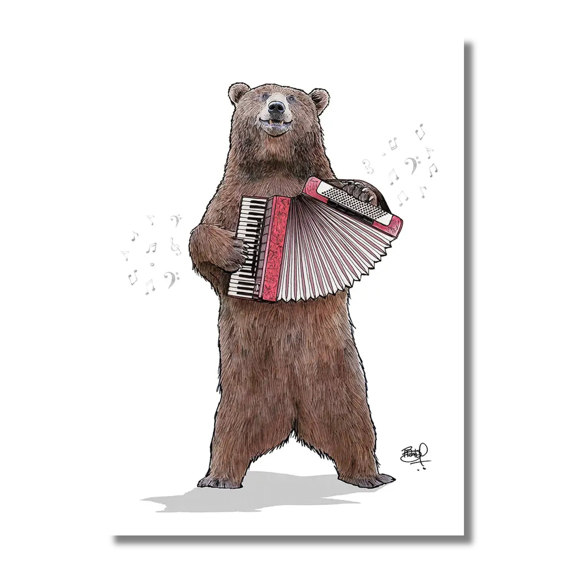 Get ready to polka with this delightful brown bear, pushing out a tune on the accordion. Measures approximately 5” x 7”, designed by Shawn Braley Illustration.