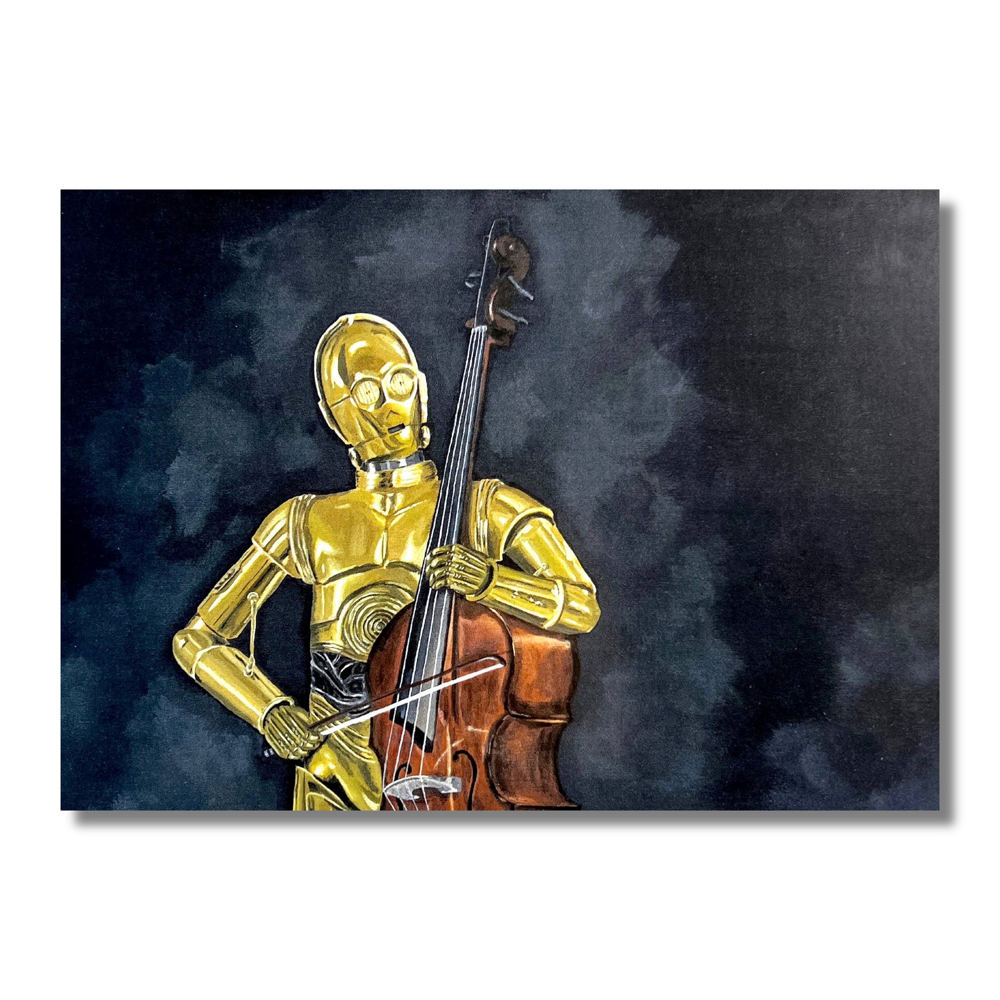 From Kristin Fardy’s Star Wars Symphony collection comes the handy and ever-knowledgeable C-3PO performing a tune on a string bass. Measures approximately 5” x 7”, perfect for sharing with a Star Wars fan or framing.