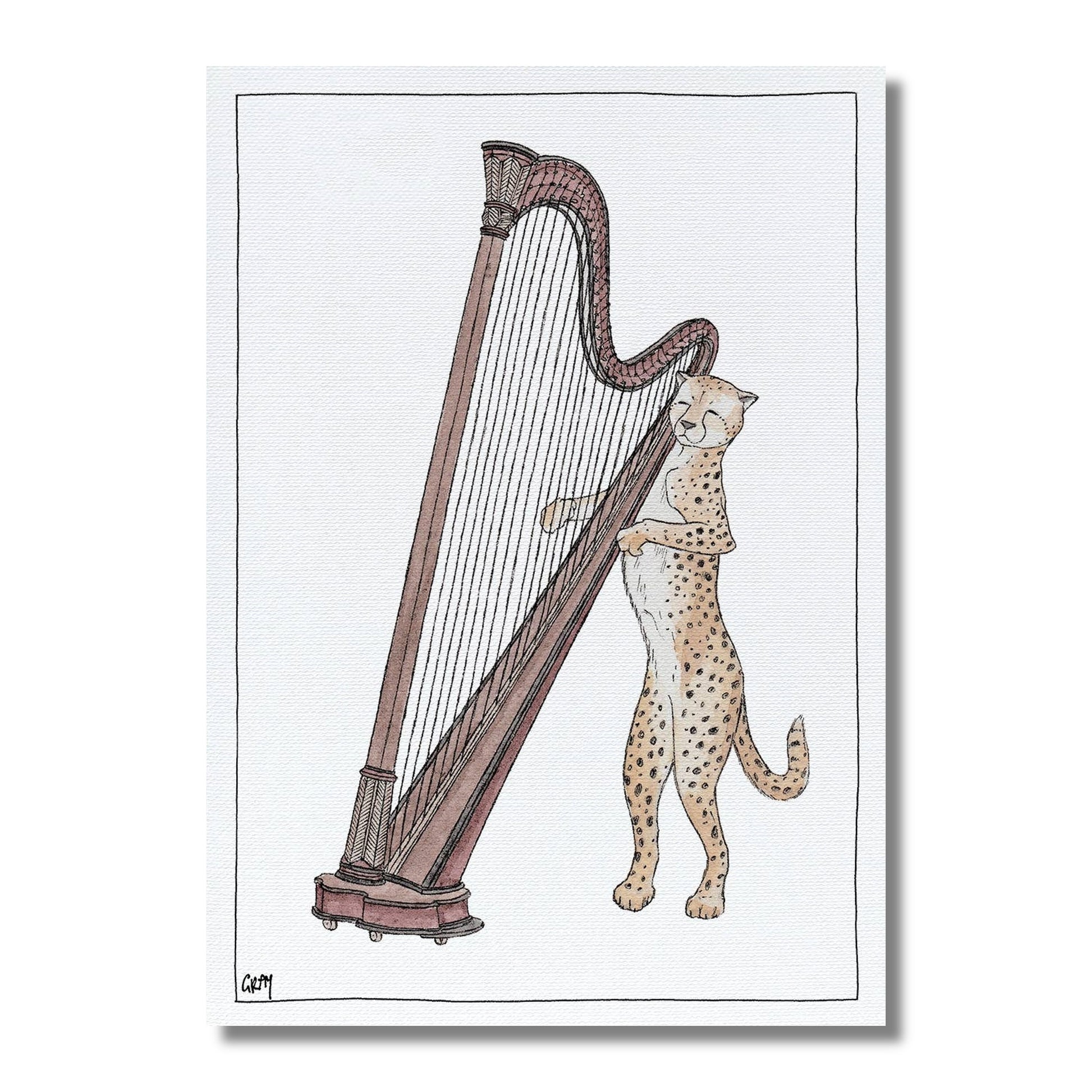 This cheetah stretches out its long claws to pluck the lowest notes on the harp and presents to you a clever tune atop a lovely greeting card. Measures approximately 5” x 7”, designed by Avi Gray.