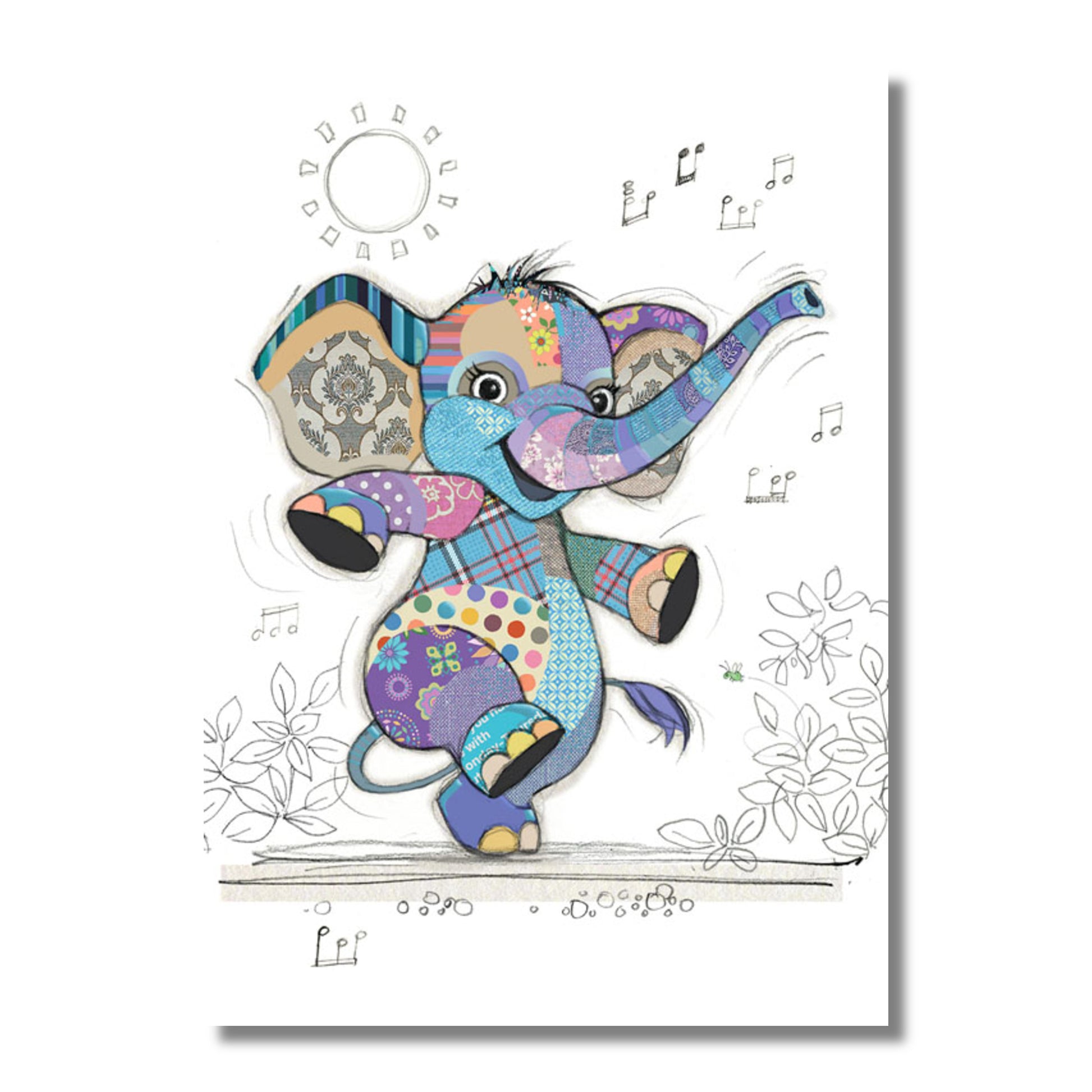 An adorable elephant is crafted from embossed details, colorful patterns and shimmering foil accents on this greeting card. Measures approximately 5" x 7".