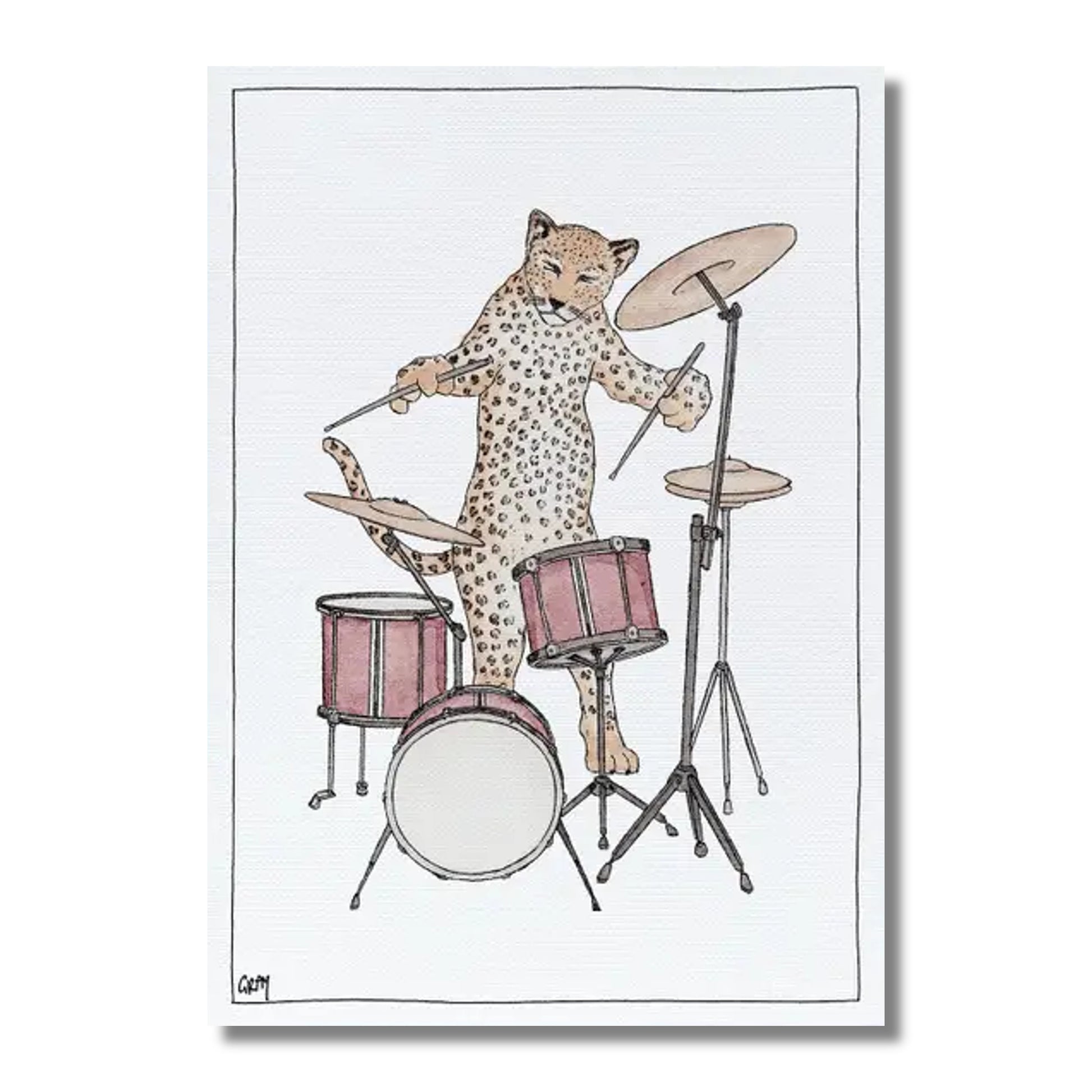 Leave the rhythm section to the leopard — they have the drum set covered on this whimsical greeting card. Measures approximately 5” x 7”, designed by Avi Gray.