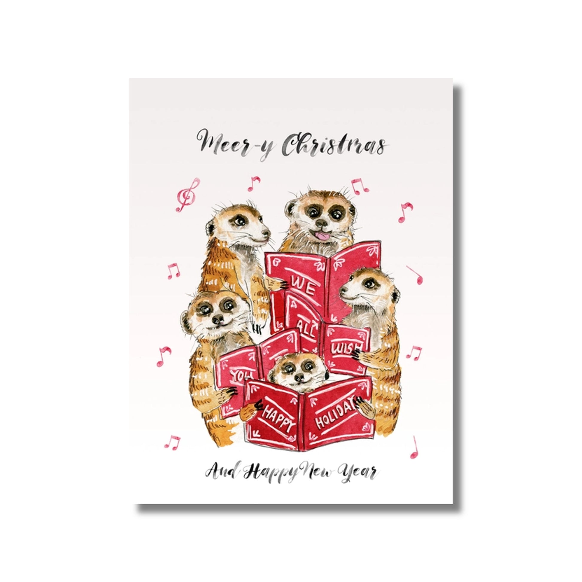 A goofy group of meerkats chirps out a Christmas tune atop this petite greeting card. Measures approximately 4.25" x 5.5".