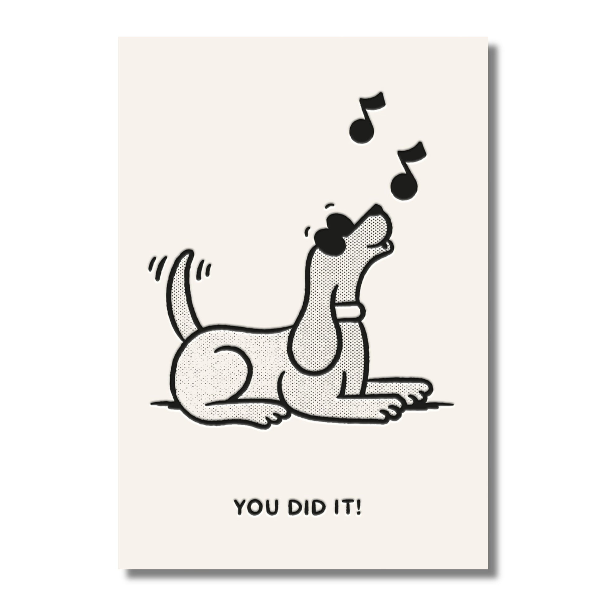 A hip dog offers congratulatory woofs on this whimsical greeting card by Studio Boketto. Measures approximately 4" x 6".