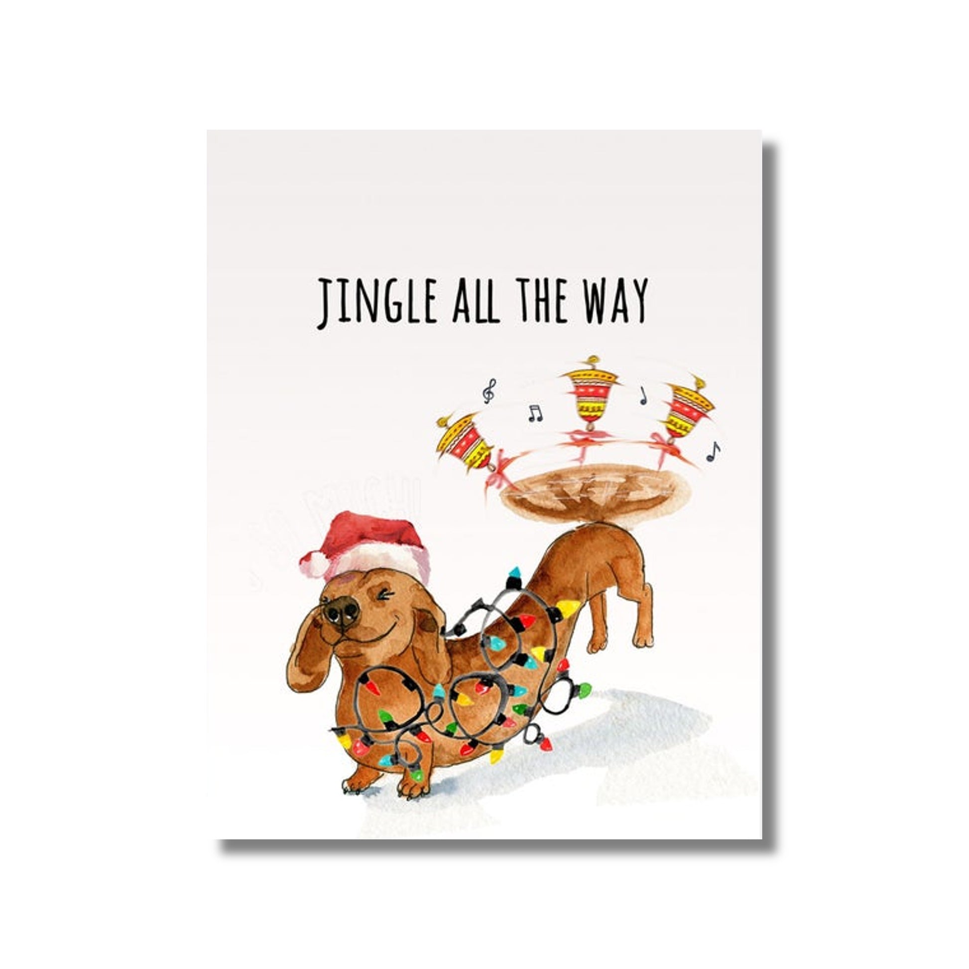 A spirited dachshund wags his tail in excitement for the holiday season atop these adorable greeting cards. Each box contains 6 cards measuring approximately 4.25" x 5.5".