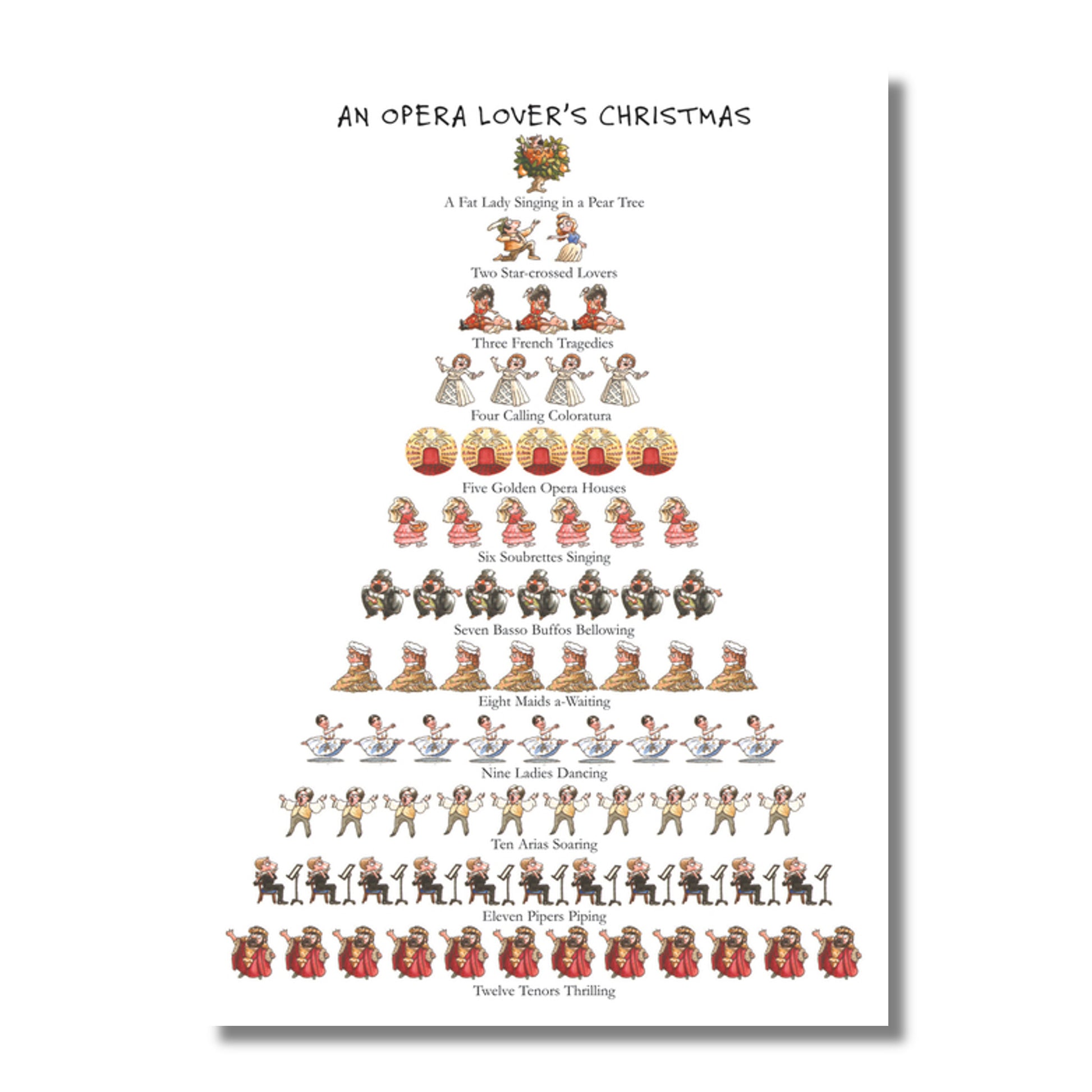 Celebrate the season with the 12 days of opera on this quirky christmas card. Measures approximately 5" x 7", designed by David Price. Each box contains 12 cards with corresponding envelopes.