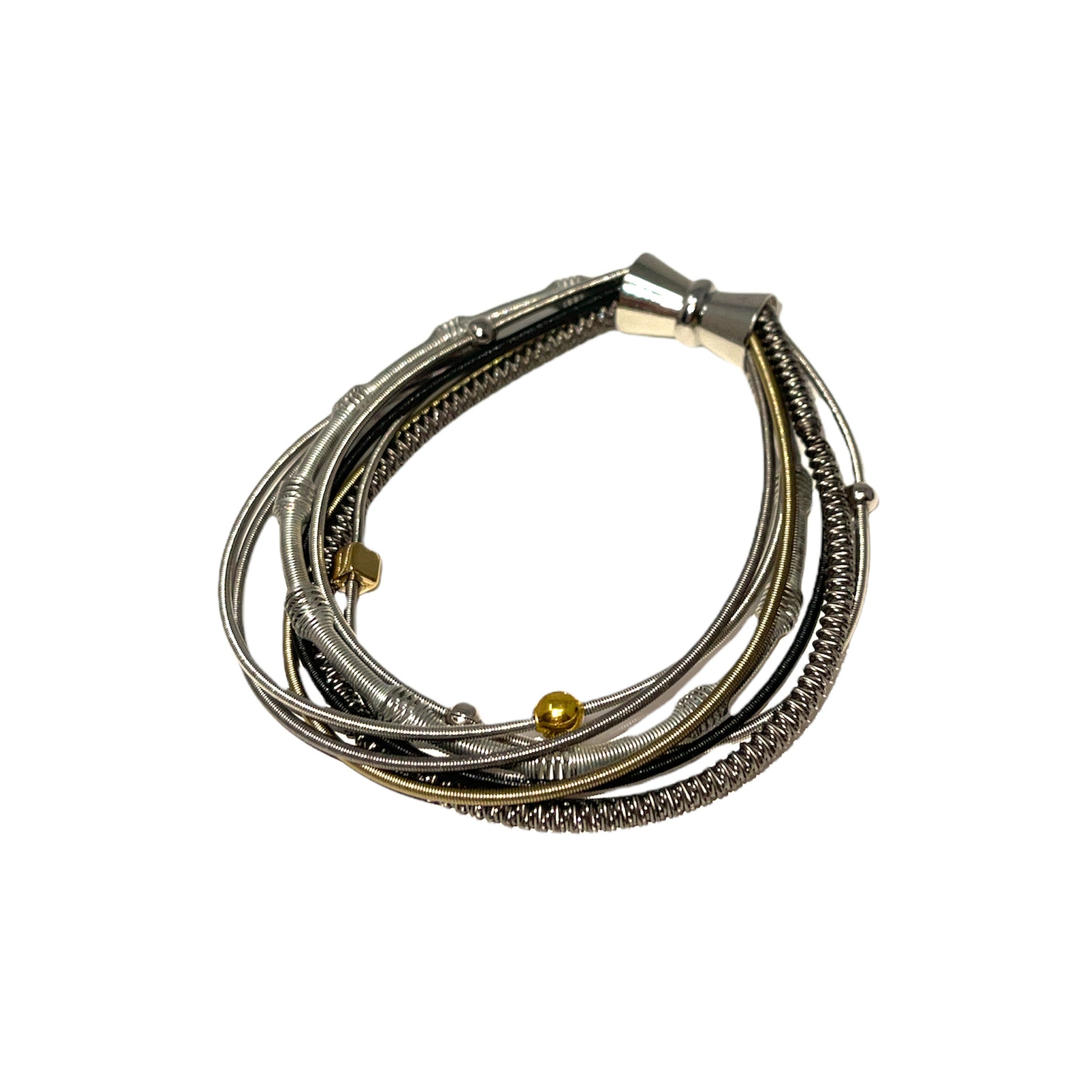 A mixture of several different piano wire strands, including some with beads, nuts, coils and springs, makes for a unique addition to any wardrobe. Measures approximately 7.5” long with a strong magnetic clasp.