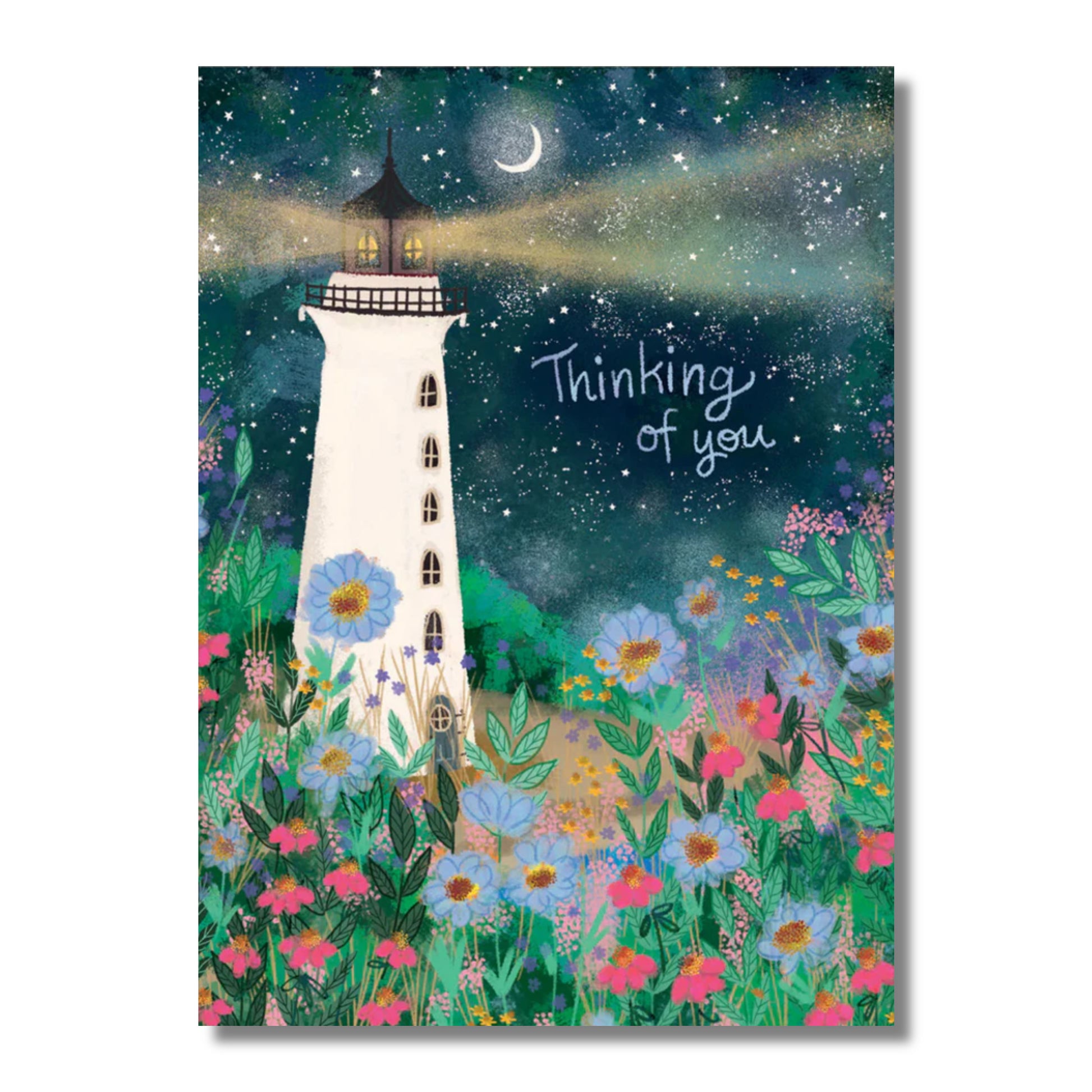 An inspiring lighthouse adorns this condolence card, along with a brilliant night sky and beautiful flowers. Measures approximately 4.75" x 6.5", illustrated by Joy Laforme.